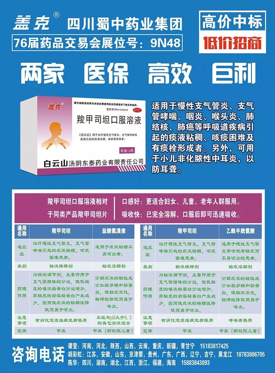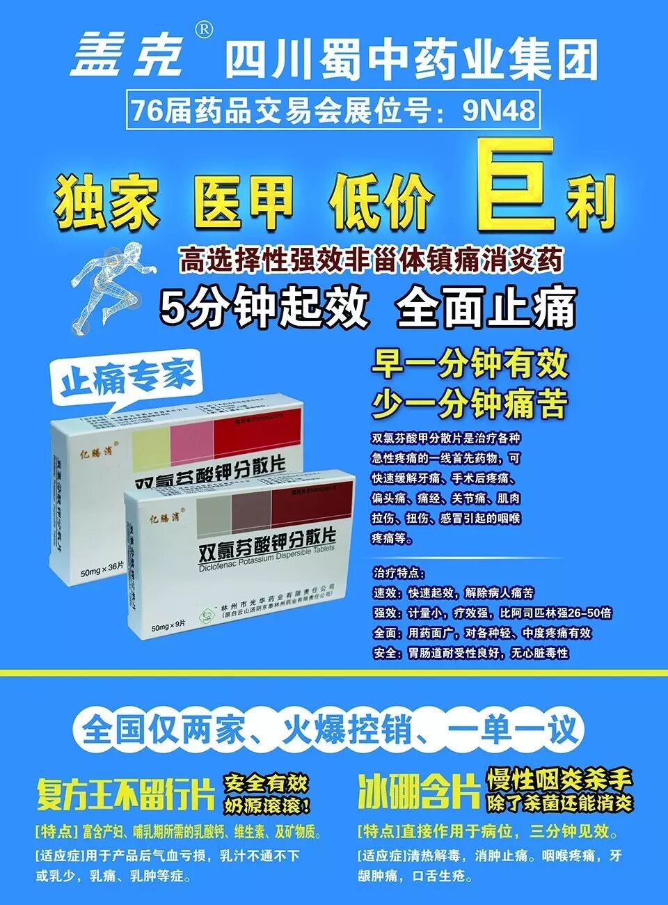 在第76届全国药品交易会(昆明滇池国际会展中心,展位号:9N48)12月2日-4日期间,蜀中集团重磅推出全国独家剂型产品参展,医保甲类、底价招商、巨额利润,欢迎药界同仁前来洽谈!