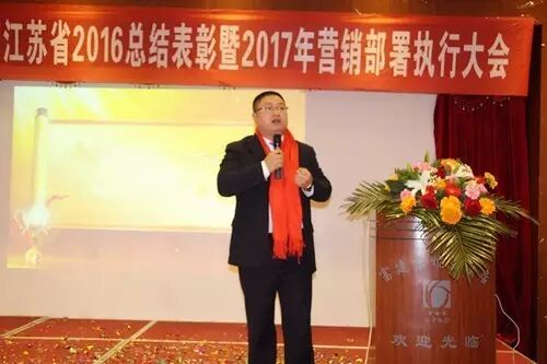 集团品牌推广部华北大区总监安新平先生对华北大区以及江苏省区2016年销售数据进行了回顾,对2017年江苏省区整年以及第一阶段的工作重心进行了安排和部署,对江苏省区管理层和县级分别提出了不断扩招团队、不断加强自身修养的要求,要求江苏省区全体销售精英要坚定不移地执行公司的各项政策,做到活学活用。