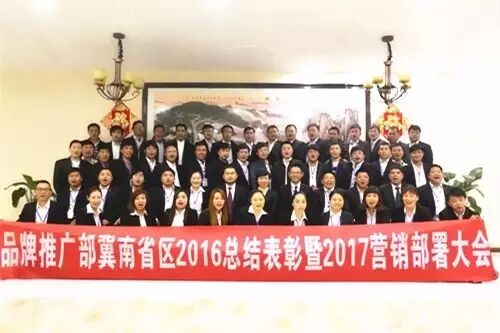 集团品牌推广部华北大区总监安新平先生通过回顾和总结2016年华北大区及冀南省区的业绩数据,对华北大区及冀南省区的工作作出重要指示和要求,要求冀南省区“着眼行业趋势,认清企业优势,发挥自我特长、坚持开好两会、全力打造单品、扩大团队规模、加强学习培训”,做好市场潜力的深挖工作用以提升市场业绩,确保2017年任务指标得以顺利完成。